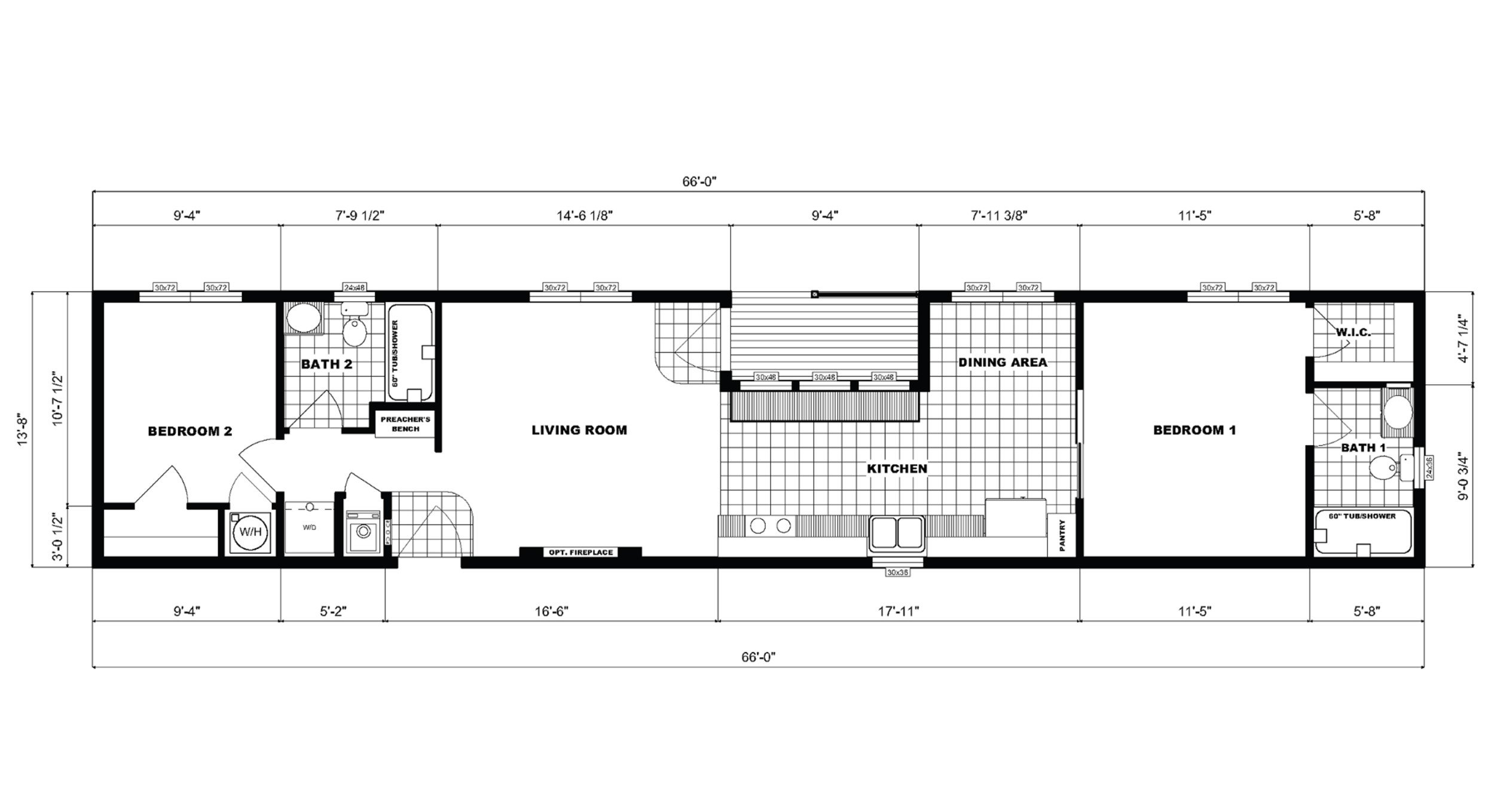 902 Sq. Ft., 2 Bedrooms/2 Baths (14’x66’)